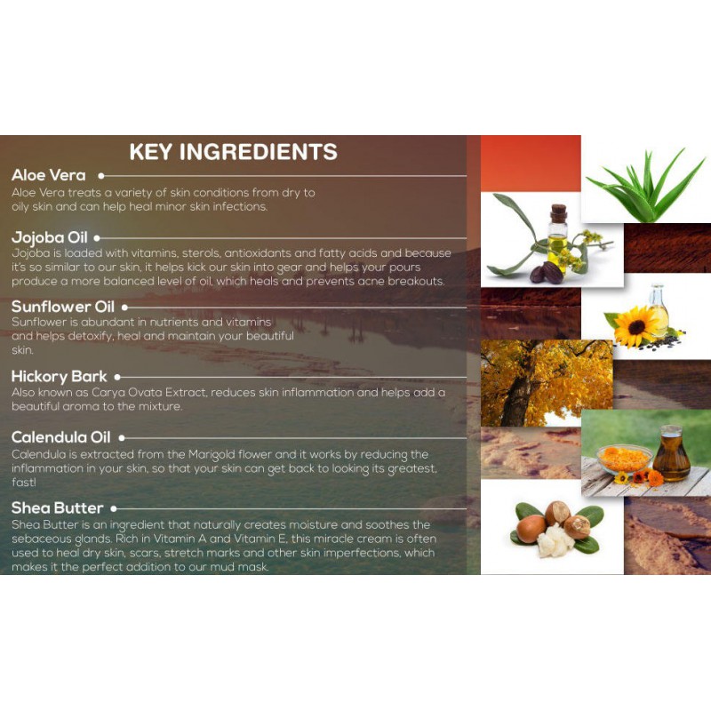 Main Ingredient | dead sea mud, organic shea butter, organic aloe vera juice, organic jojoba oil |