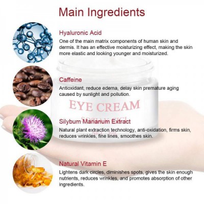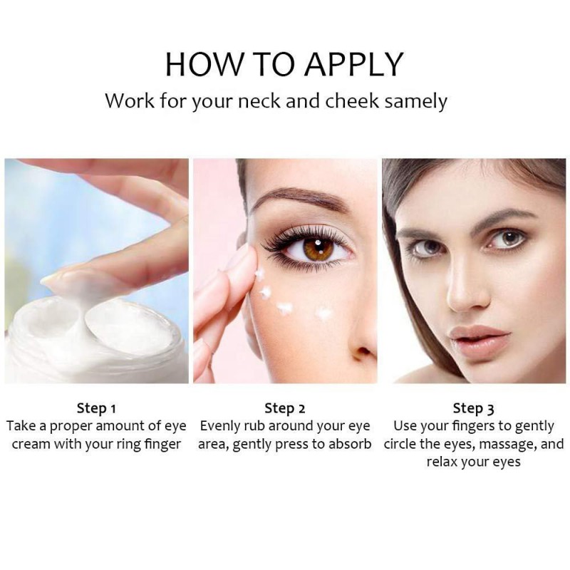 This powerful blend of lightweight cream formula can soften, smooth and replenishes under eye area, instantly helps fade away signs of fatigue while absorbing in to skin, smooth the way for makeup. Our eye cream helps alleviate skin puffiness with Caffeine, plumps up the appearance of skin with hydrating power of Hyaluronic Acid. Visibly diminishes the appearance of under eye darkness. The delicate skin around the eyes is strengthened and better able to protect itself against signs of aging.