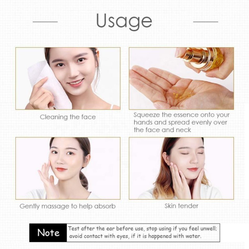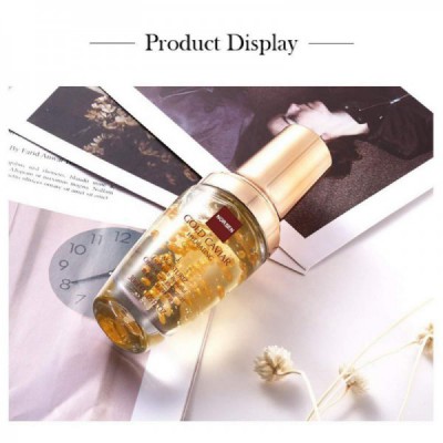 Water, 24k Gold Foil Particles,Caviar,Butylene Glycol, Glycerin Sodium Hyaluronate, Niacinamide, Camellia Sinensis Leaf Extract Biosaccharide Gum-1, Alcohol, Propolis Extract Sodium Polystyrene Sulfonate, Carbomer Propanediol, Chlorphenesin Panicum Miliaceum (Millet) Seed Extract, Royal Jelly Extract, Centella Asiatica Extract Portulaca Oleracea Extract, Acetyl Hexapeptide 8 Aloe Barbadensis Leaf Extract, Hydroxyethylcellulose Caprylyl Glycol, Glyceryl Acrylate