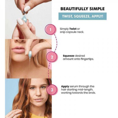 Twist or snip capsule neck to open • Dispense the serum onto fingertips and then apply through the hair starting mid-length, working towards the ends • Use after shampooing on towel-dried hair or on dry hair to help improve manageability.