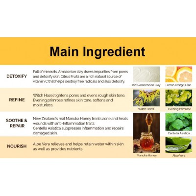 100% Amazonian Clay,Lemon Organic Lime,Witch Hazel,Evening Primrose,Aloe Vera,Honey,Vitamin C,Collagen,Glycerin